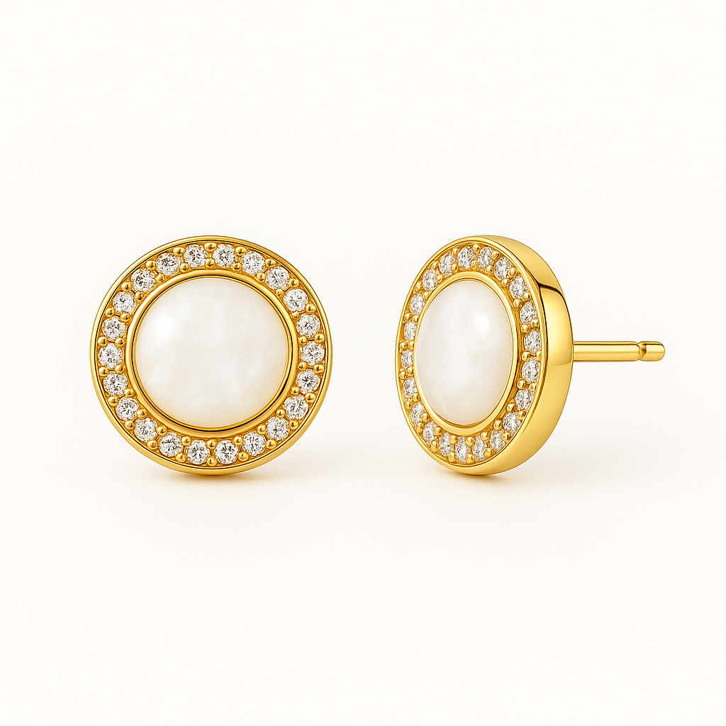 Handcrafted with a fine 18K gold-plated setting and genuine mother-of-pearl centers, surrounded by a delicate halo of crystals, they reflect light with quiet elegance and timeless allure.